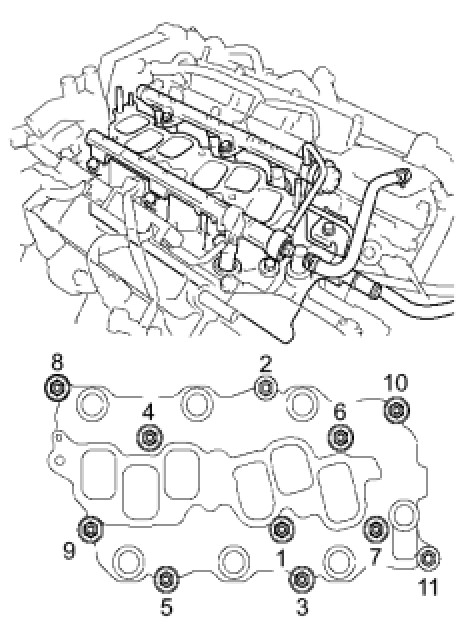 Install the intake manifold with the 9 bolts, 2 nuts and 2 washers. Using several steps, tighten the bolts and nuts uniformly in the sequence shown in the illustration.