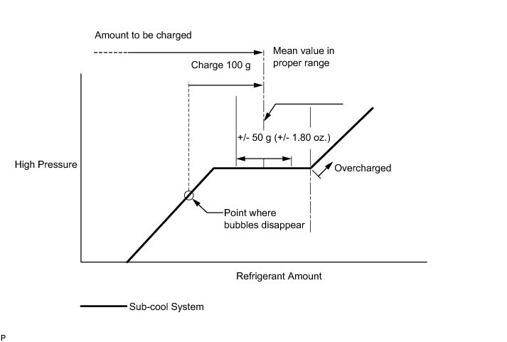 * Approximately 100 g (3.5 oz.) of refrigerant may need to be charged after bubbles disappear. The refrigerant amount should be checked by quantity, not with the sight glass.