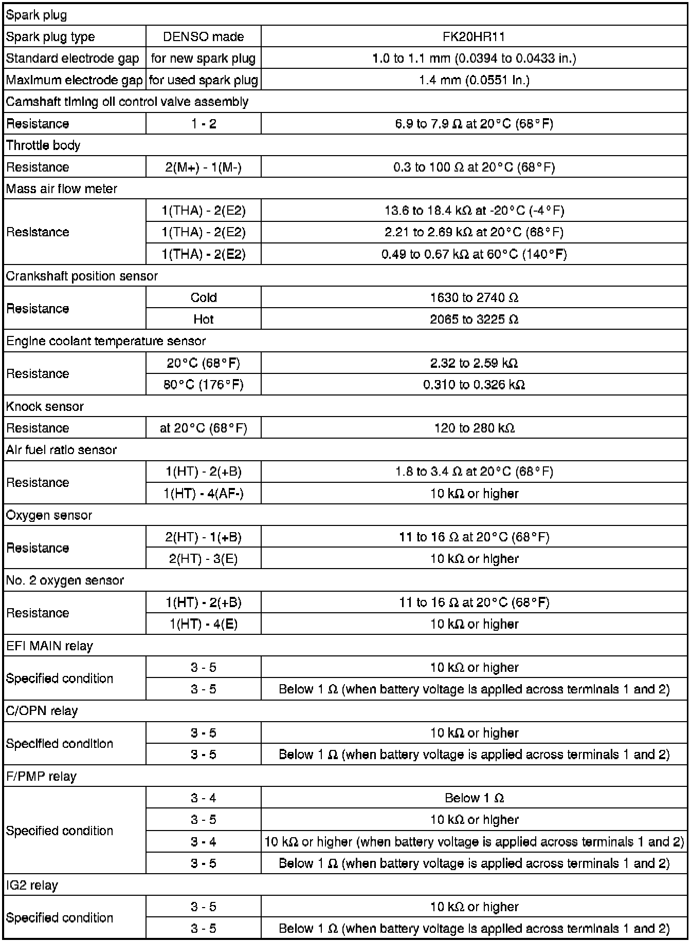 SPECIFICATIONS: ENGINE CONTROL: SERVICE DATA