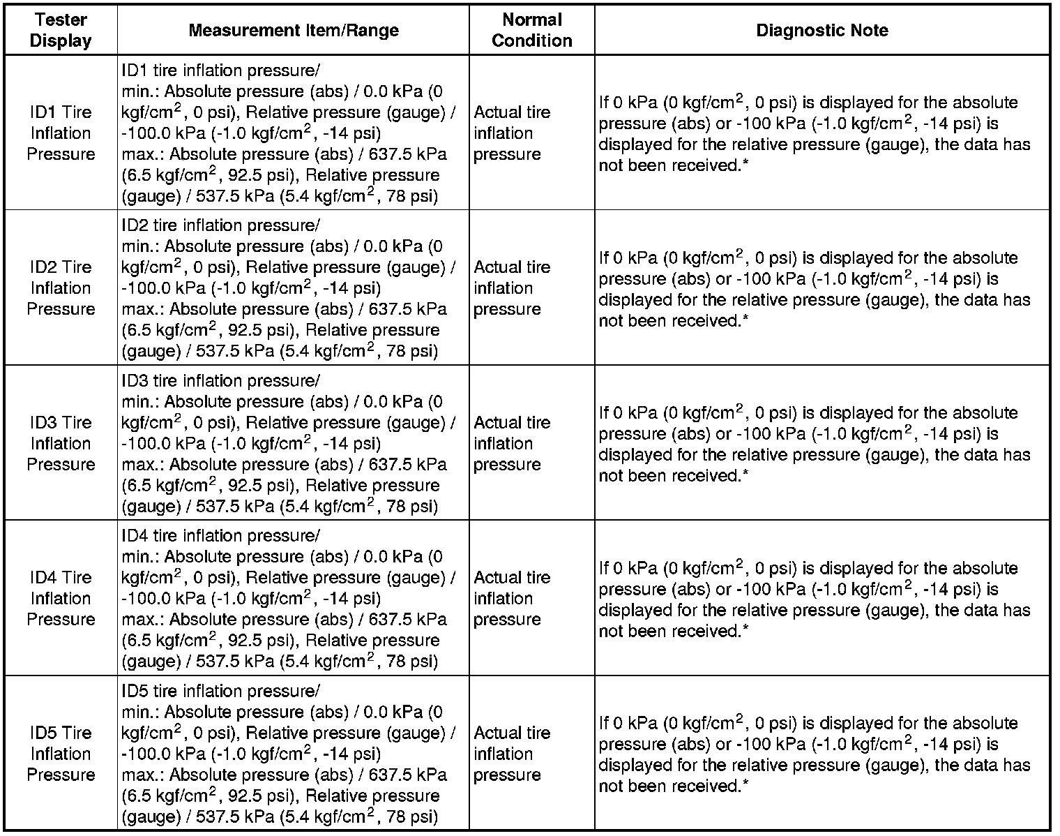 * The initialization is complete when the Data List "ID Tire Inflation Pressure" display shows the correct pressures.