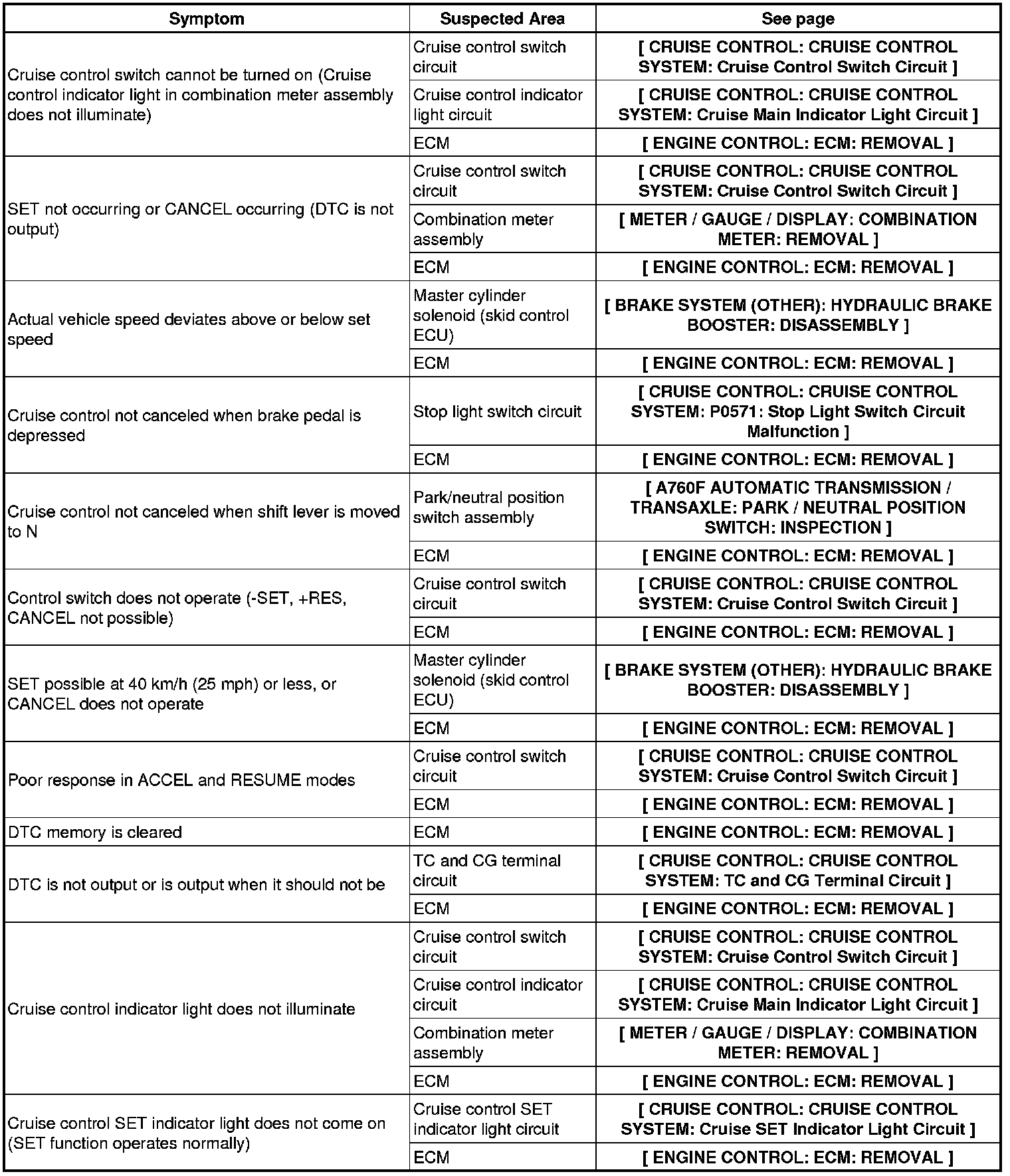 CRUISE CONTROL: CRUISE CONTROL SYSTEM: PROBLEM SYMPTOMS TABLE