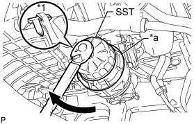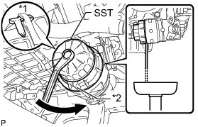 (a) Using SST, loosen the oil filter cap 4 revolutions, align the cap ribs vertically and drain the remaining engine oil in the oil filter cap.