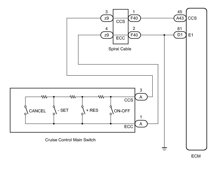 The cruise control main switch operates 7 functions: SET, - (COAST), TAP-DOWN, RES (RESUME), + (ACCEL), TAP-UP, and CANCEL. The SET, TAP-DOWN, and - (COAST) functions, and the RES (RESUME), TAP-UP, and + (ACCEL) functions are operated with the same switch. The cruise control main switch is an automatic return type switch which turns on only while operating it in the direction of each arrow and turns off after releasing it. The internal contact point of the cruise control main switch is turned on with the switch operation. Then the ECM reads the voltage value that has been changed by the switch operation to control SET, - (COAST), RES (RESUME), + (ACCEL), and CANCEL.