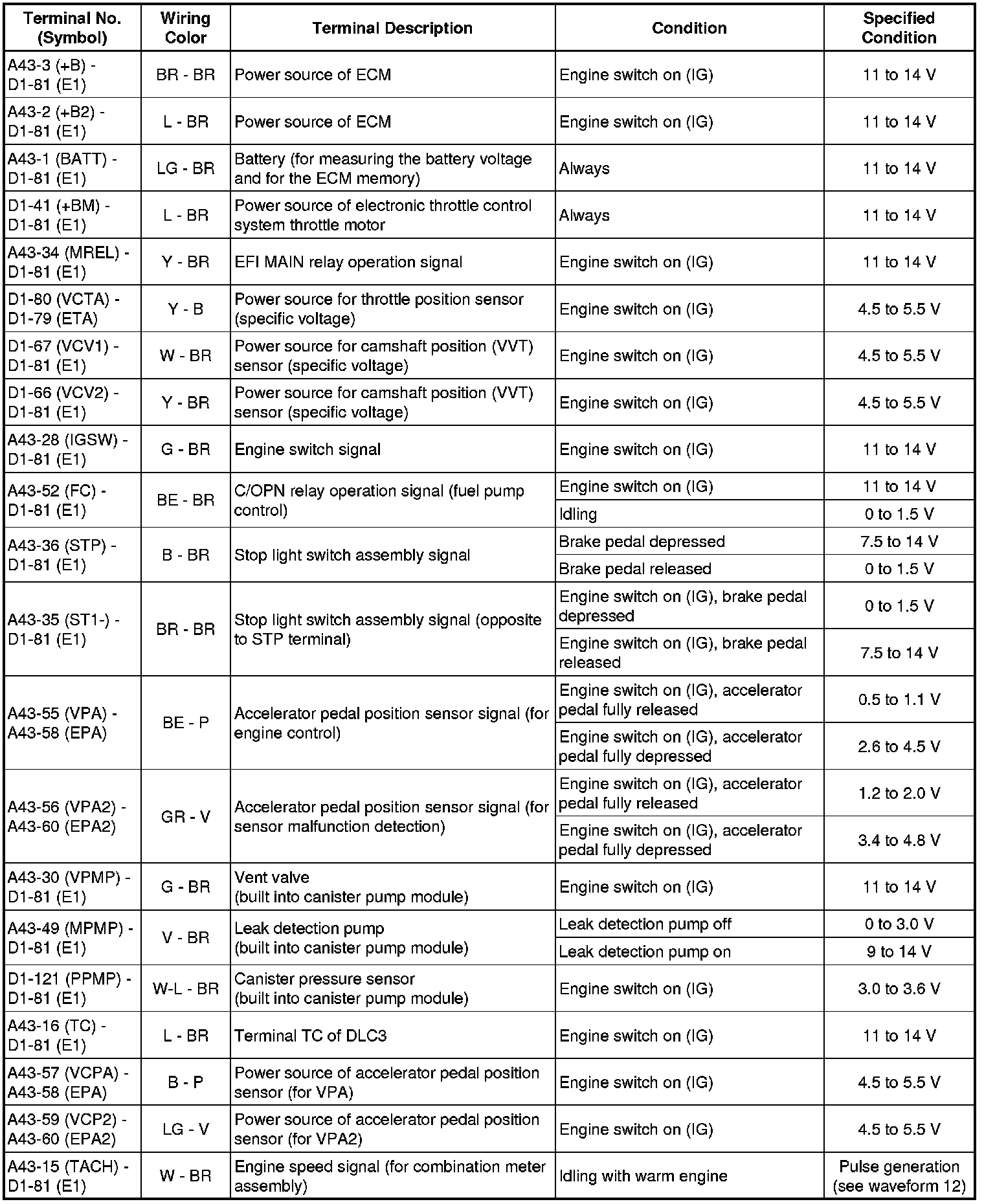 The standard normal voltage between each pair of the ECM terminals is shown in the table below. The appropriate conditions for checking each pair of the terminals are also indicated.