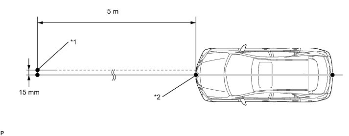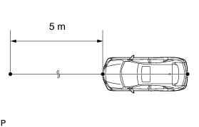 (2) Set one end of the 10 m (32.8 ft.) string on the vehicle's rear center point. Run the string over the vehicle's front center point to a position 5 m (16.4 ft.) beyond the vehicle's front center point, as shown in the illustration. Mark the 5 m (16.4 ft.) position.