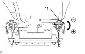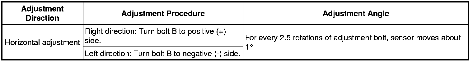 * If "LEFT SIDE: 1.0°" is displayed, the divergence is 1.0° in the left direction. Turn bolt B approximately 2.5 turns to the negative (-) side.