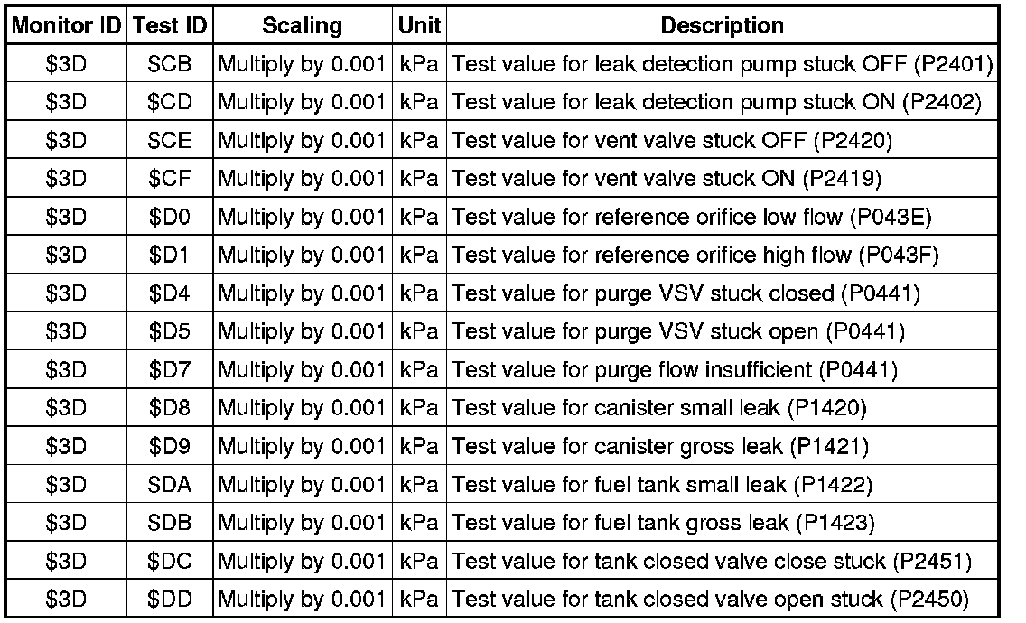 When using a generic scan tool, multiply the test value by the scaling value listed below.