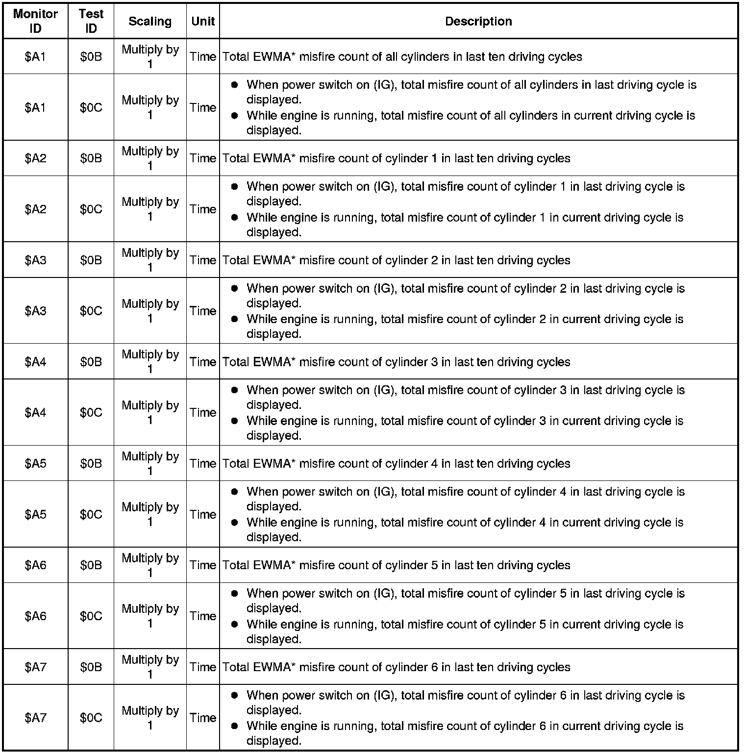 *: EWMA (Exponential Weighted Moving Average) misfire counts for last 10 driving cycles (calculated) Calculation: 0.1 x (current counts) + 0.9 x (previous average) Initial value for (previous average) = 0