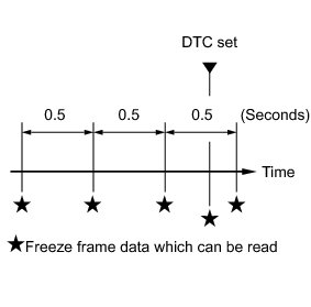 * The ECM records engine conditions in the form of freeze frame data every 0.5 seconds. Using the Techstream, 5 separate sets of freeze frame data, including the data values at the time when the DTC was set, can be checked.