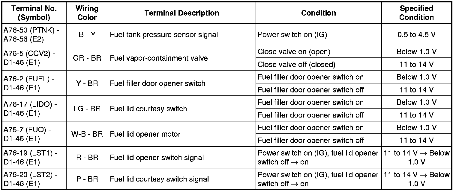 The standard normal voltage between each pair of the ECM terminals is shown in the table below. The appropriate conditions for checking each pair of the terminals are also indicated.