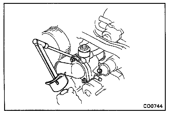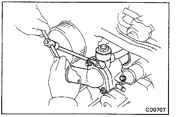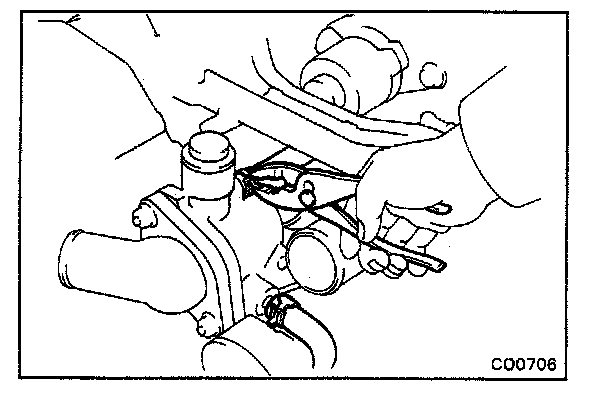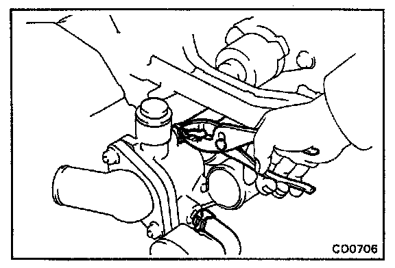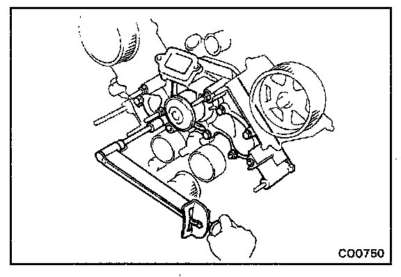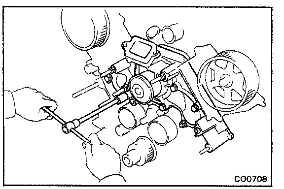(b) Remove the water pump carefully by prying with a screwdriver between the water pump and cylinder block.