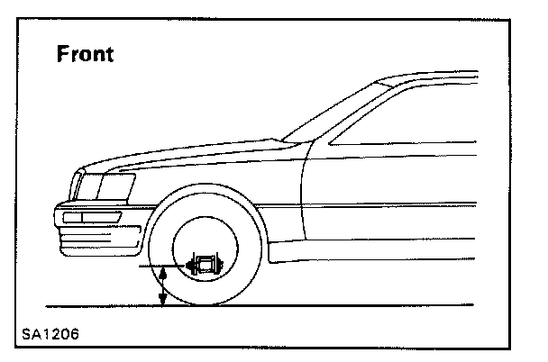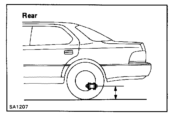 Measure front ride height from ground to center of lower suspension arm mounting bolt. Measure rear ride height from ground to center of No. 2 lower suspension arm mounting bolt. Refer to Figs. 7 and 8. Front ride height should be 9.21 inches. Rear ride height should be 9.53 inches. If height is not correct, try settling suspension. If height is still not correct, check for bad springs or suspension components. Air Suspension