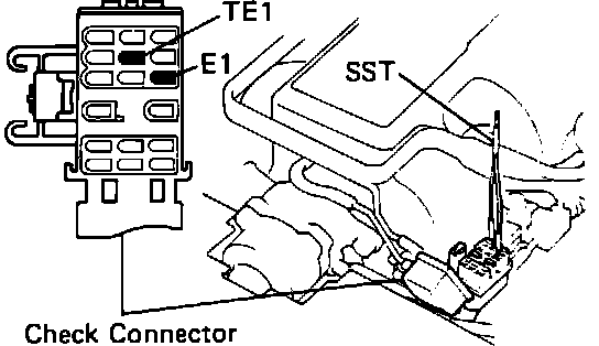 - Using a suitable jumper wire, short check connector terminals TE1 and E1 together.
