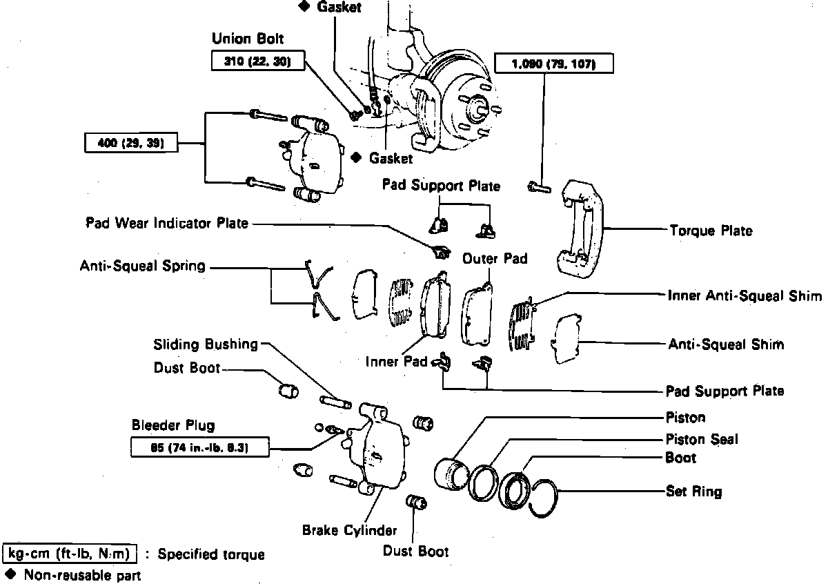 6. Install caliper and bolts. Torque bolts to 29 ft. lbs.