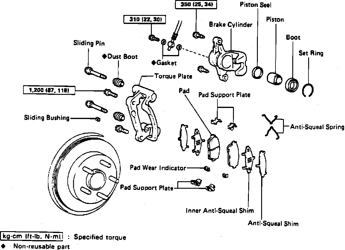 1. Remove caliper bolts from torque plate, then the caliper. Do not let caliper hang by brake hose.