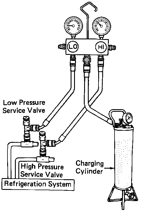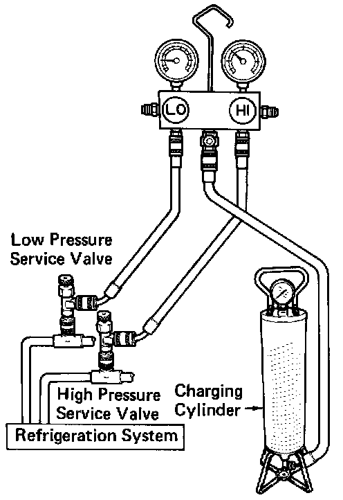 (b) Charge the system with specified amount of refrigerant, then close the high pressure hand valve.