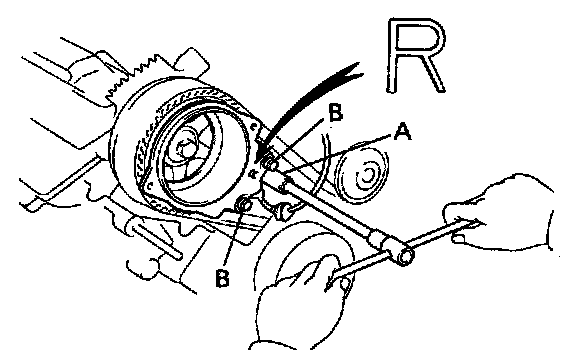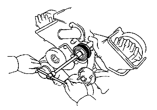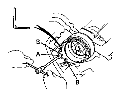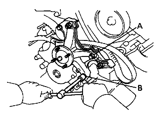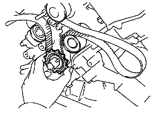 (b) Check that each pulley aligns with the timing marks as shown in the illustration. If the marks do not align remove the timing belt and reinstal it.