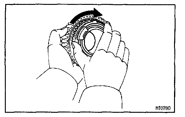 b. Check the braking effect of the synchronizer ring. A Turn the synchronizer ring in one direction while pushing it to the gear cone and check that the ring is locked.