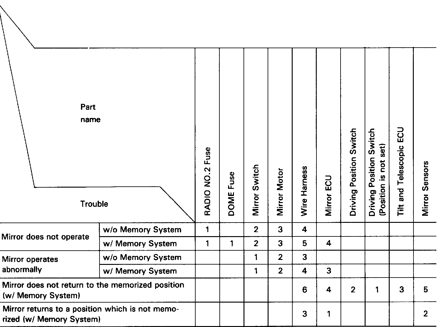 You will find the cause of trouble more easily by properly using the table shown below. In this table, the numbers indicate the order of priority of the causes of trouble. Check each part in the order shown. If necessary, replace the part.