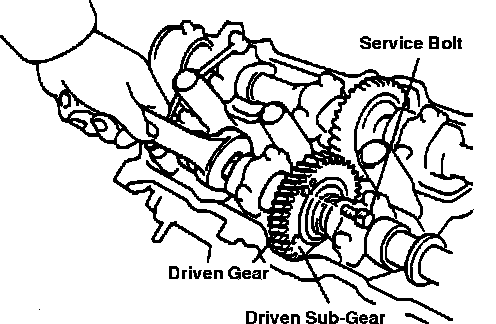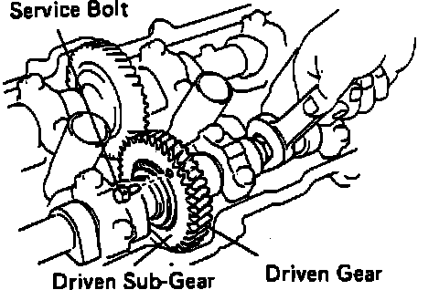 a. Bring service bolt hole of righthand exhaust camshaft upward by turning exhaust cam with wrench. Secure cams by placing service bolt through sub-gear and driven gear, Fig. 14.