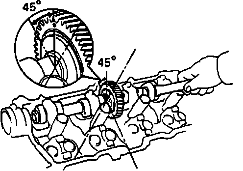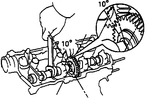 b. Set timing mark of exhaust camshaft driven gear at 10° angle by turning cam with wrench, Fig. 15.