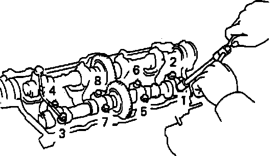 c. Remove two bearing cap bolts holding oil feed pipe, then loosen and remove bearing cap bolts in sequence in Fig. 16. After bolts are removed, remove oil feed pipe, bearing caps and camshaft.