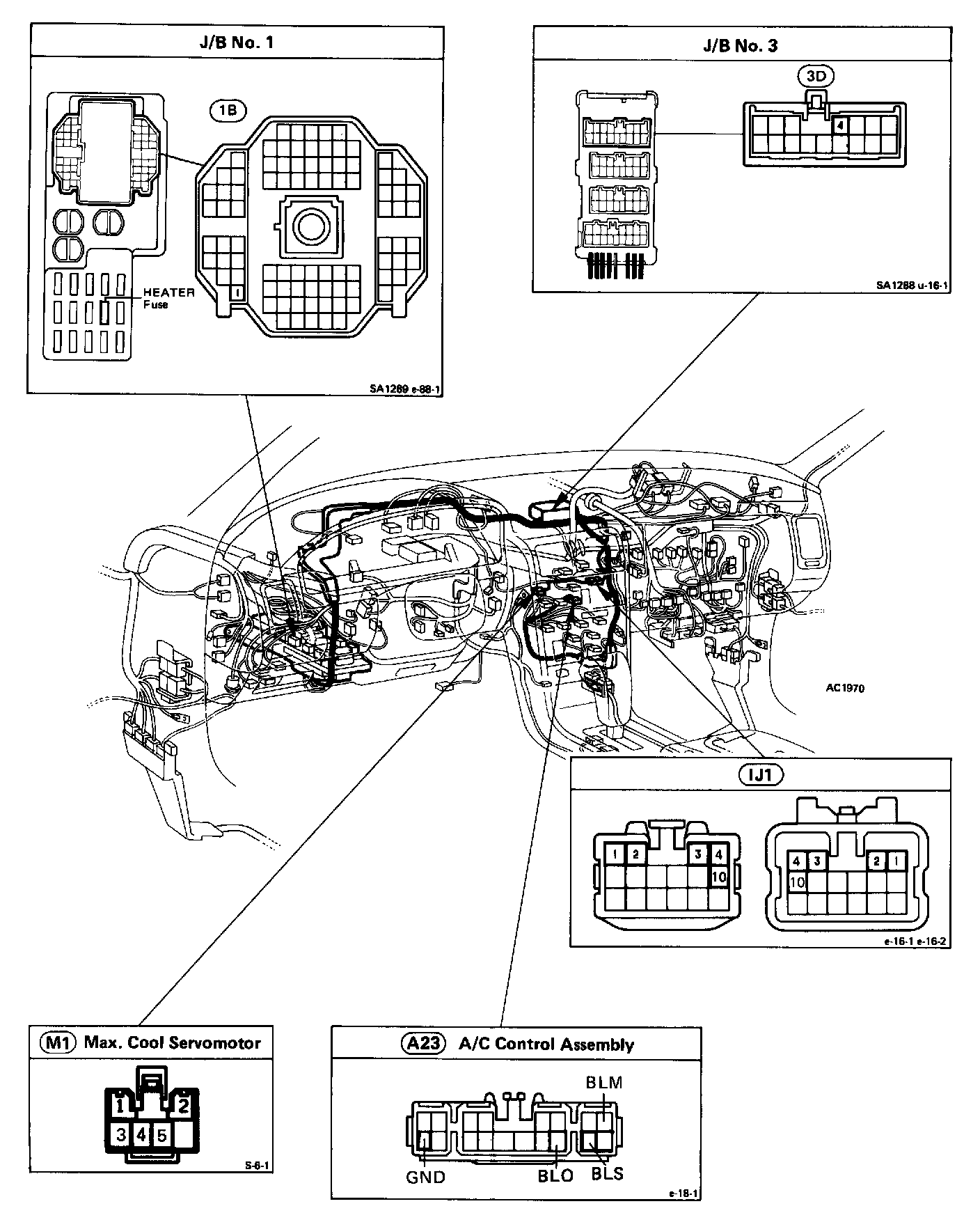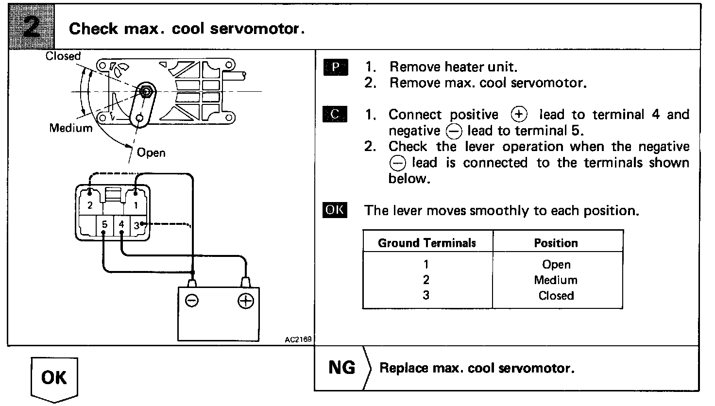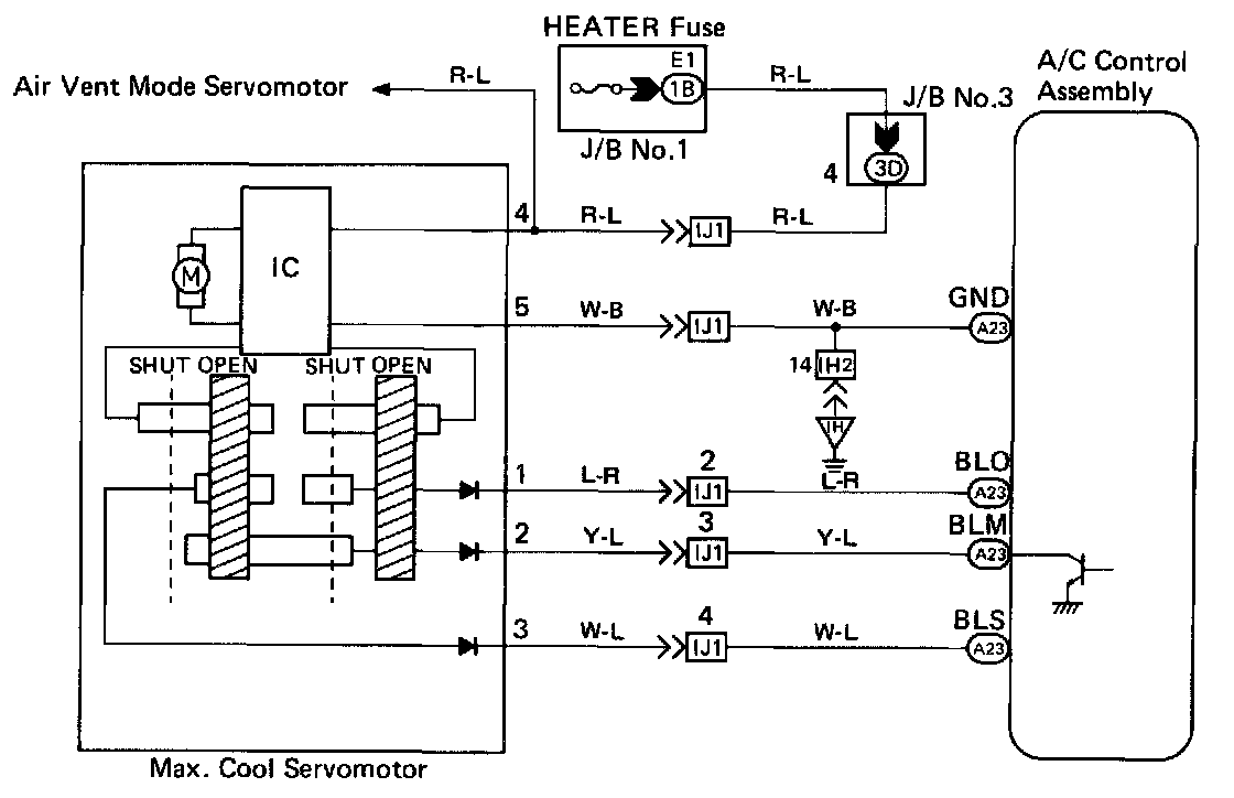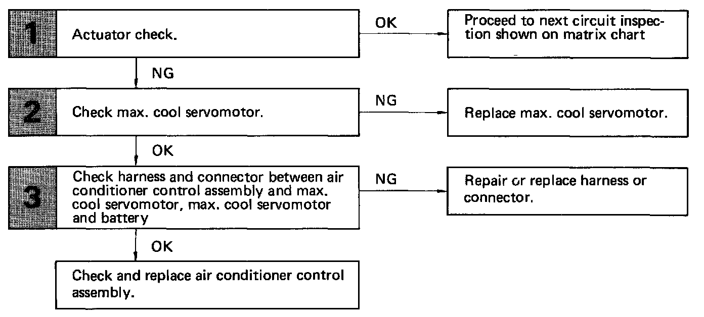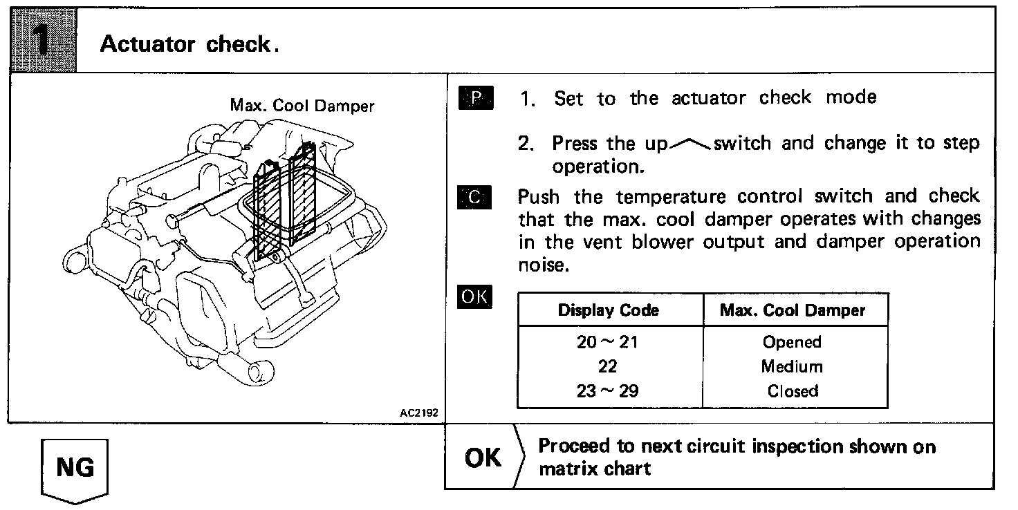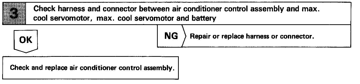 The max. cool servomotor changes the positions of the max. cool damper in 3 positions by the signals from the ECU. When the AUTO switch is no, and the vent is in (FACE) position, the air conditioner control assembly controls the damper to open, half open and closed positions. The damper is kept closed at all times while in the (FOOT) or (BI-LEVEL) position.