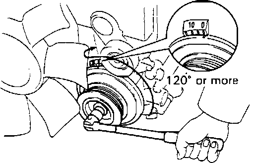- Bring crankshaft back clockwise until the crank pulley timing mark aligns with the TDC mark on the cover.