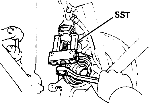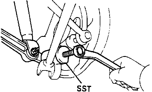 g. Remove nut from No. 2 lower suspension arm, then using special service tool No. 09610-20012 or equivalent, disconnect suspension arm, Fig. 11.