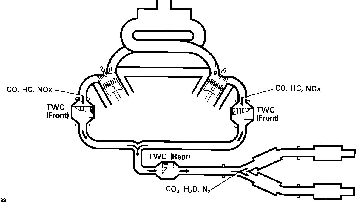 Three separate three way catalytic converters simultaneously remove up to 90% of all three major pollutants, (HC, CO, and oxides of nitrogen). A complete catalytic reaction depends on the fuel mixture staying within a very narrow range ±1% of 14.7:1 which can only be achieved with a properly functioning oxygen sensor system.