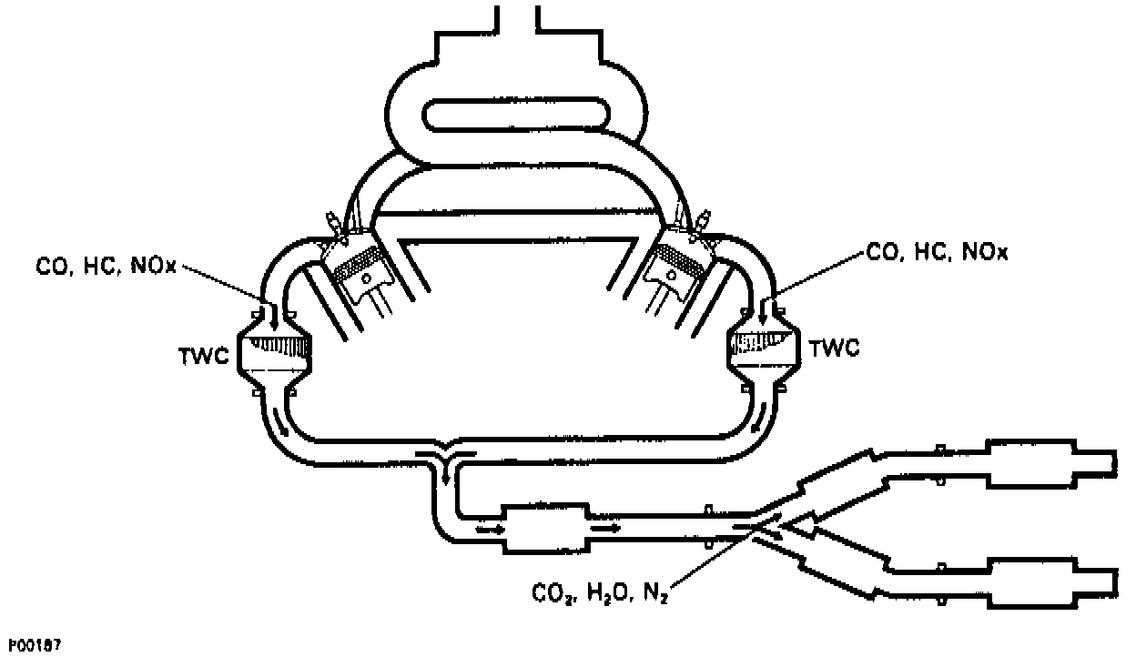 This system incorporates the use of two Main Three Way Catalytic Converters (TWC), one for each cylinder bank. The TWC simultaneously removes up to 90% of all three major pollutants, Hydrocarbons (HC), Carbon Monoxide (CO) and Oxides of Nitrogen (NOx). A complete catalytic reaction depends on the fuel mixture staying within a very narrow range (±1% of 14.7:1) which can only be achieved with a properly functioning oxygen sensor feedback system.