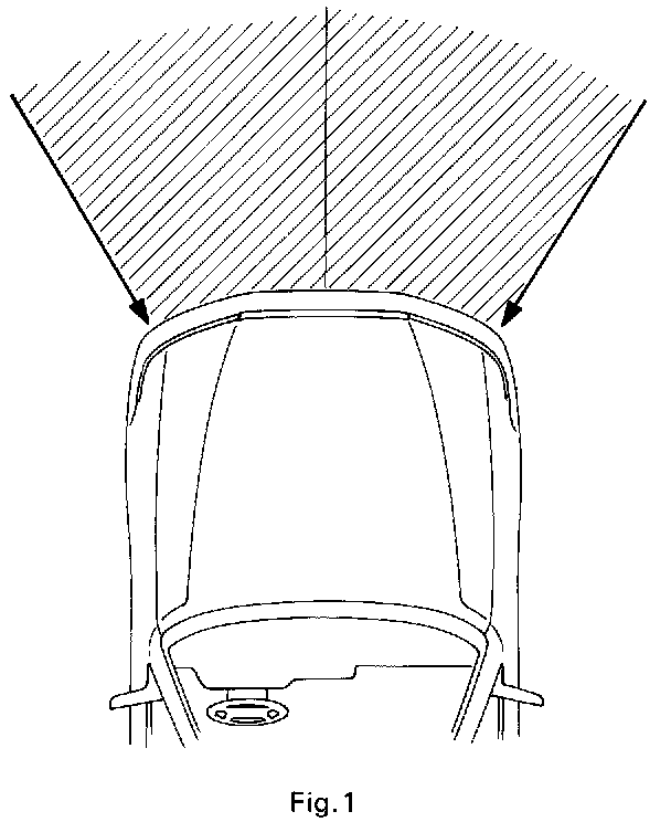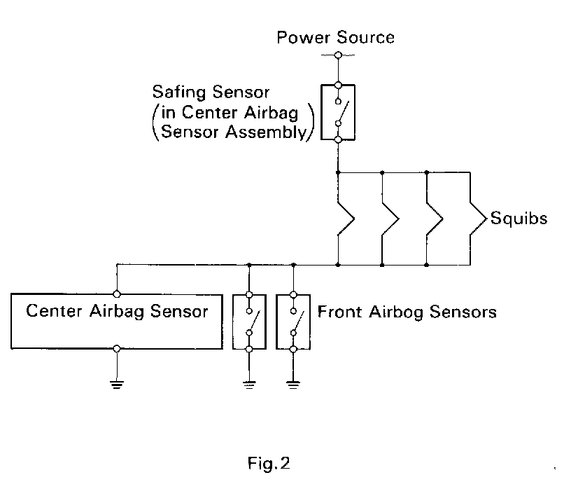 When the vehicle is involved in a frontal collision in the hatched area (Fig. 1) and the shock is larger than a predetermined level, the SRS is activated automatically. A safing sensor is designed to go on at a smaller deceleration rate than the front and center airbag sensors. As illustrated in Fig. 2, ignition is caused when current flows to the squib, which happens when a safing sensor and a front airbag sensor and/or the center airbag sensor go on simultaneously. When a deceleration force acts on the sensors, four squibs in the seat belt pretensioners (LH, RH), driver airbag and front passenger airbag ignite and generate gas. The gas in the seat belt pretensioners forces down the piston to tension the wire, thus making the seat belt retractor roll up the seat belts. The gas discharging into the driver and front passenger airbags rapidly increases the pressure inside the bags breaking open the steering wheel pad and instrument panel door.