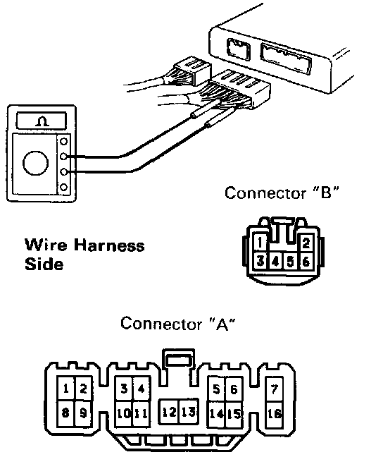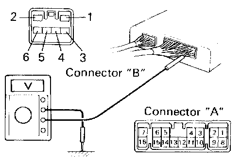 Connect the connectors and using a voltmeter with high impedance (10 kohms/V minimum), measure the voltage at each terminal and body ground.