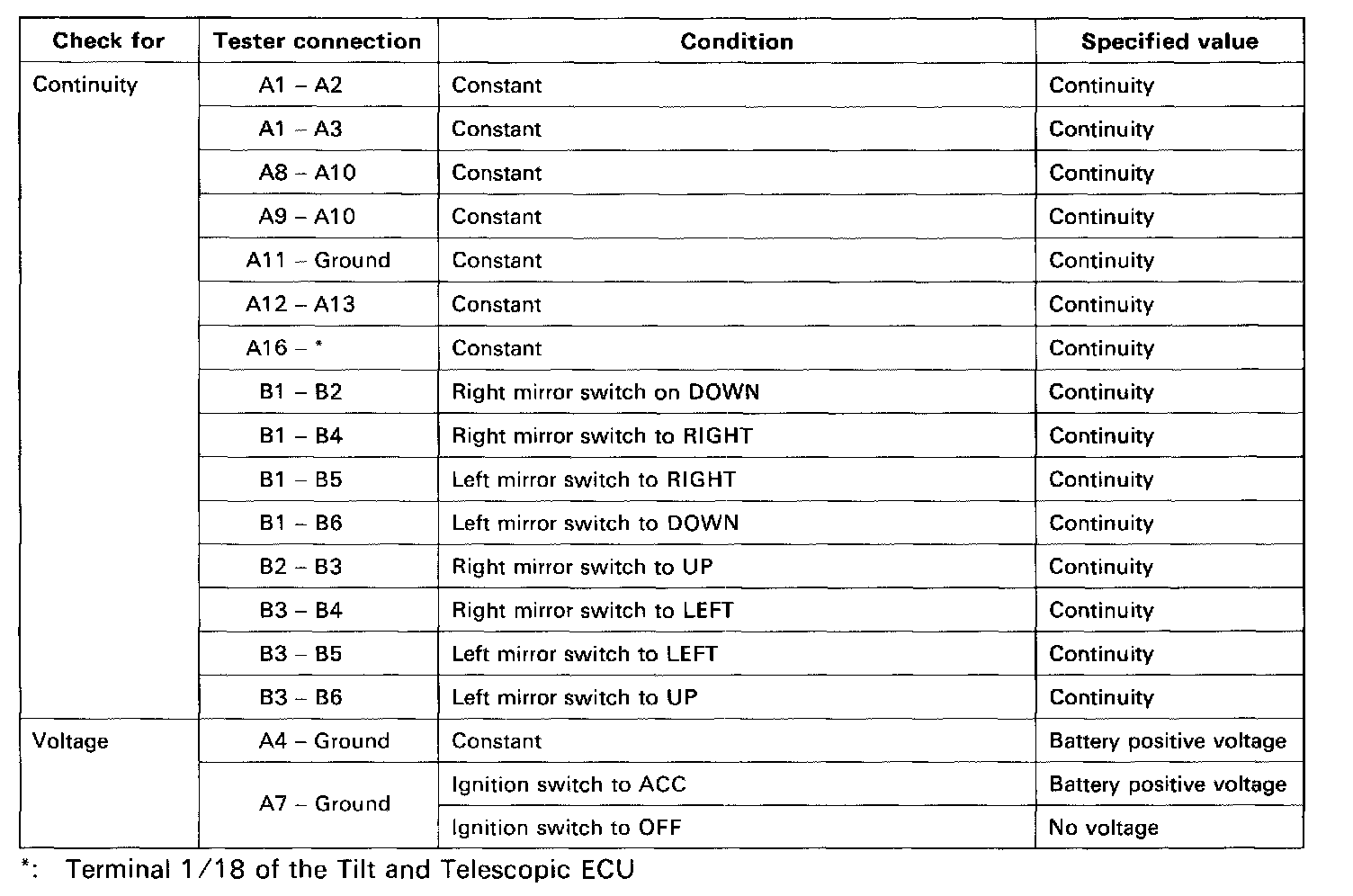 If operation is not as specified, inspect the wire harness and mirror switch or motor assembly. Then if these are correct, replace the ECU.
