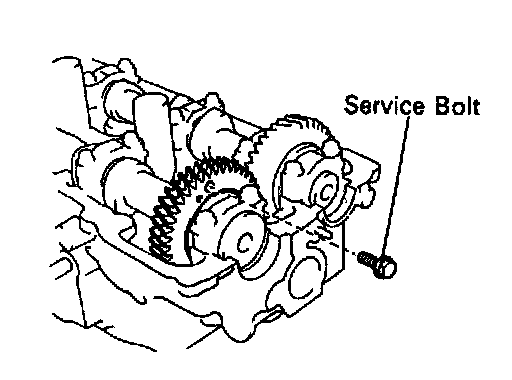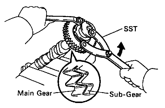 (d) Using SST, align the holes of the camshaft main gear and sub-gear by turning camshaft sub-gear counterclockwise, and temporarily install a service bolt.