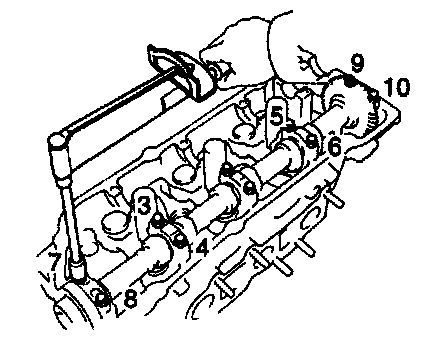 (f) Install and uniformly tighten the 10 bearing cap bolts, in several passes, in the sequence shown.