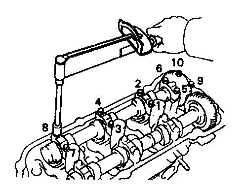 (i) Install and uniformly tighten the 10 bearing cap bolts, in several passes, in the sequence shown.