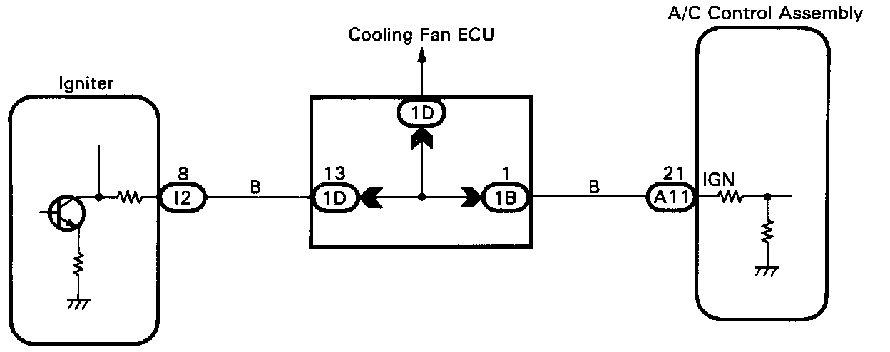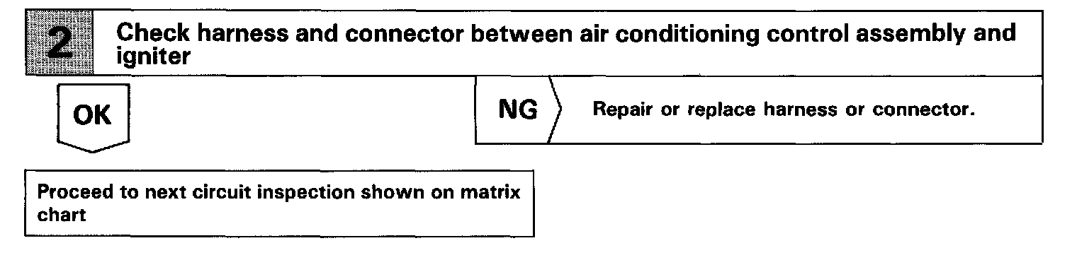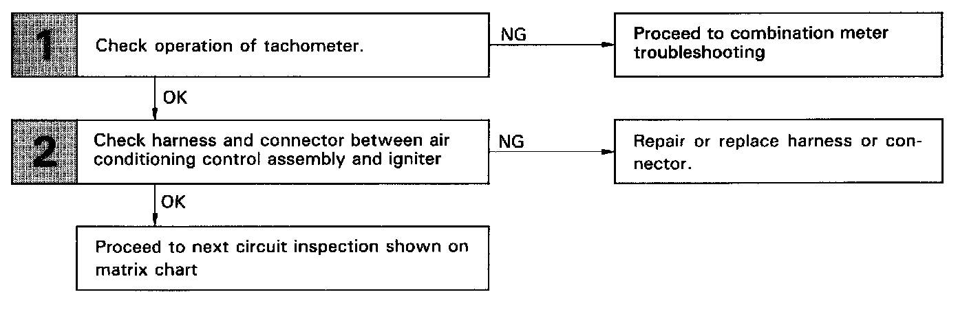 This air conditioning control assembly monitors the engine speed through signals sent from the igniter. The air conditioning control assembly uses these signals and compressor speed signals to detect the compressor lock condition.