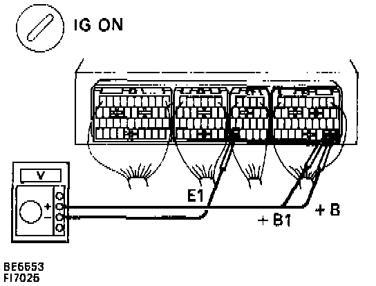 - Measure voltage between terminals + B, + B1 and E1 of Engine Control Module connector.