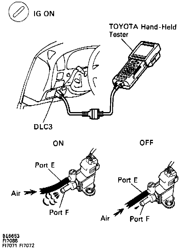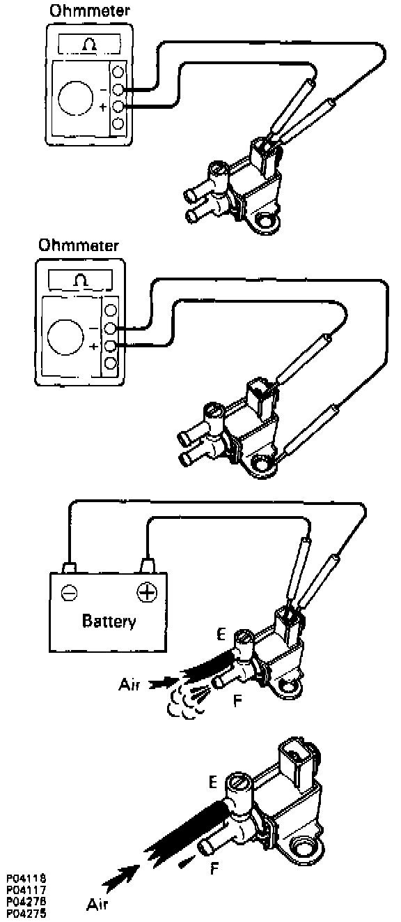 A/C idle-up Vacuum Switching Valve is 0FF: the air does not flow from port E to port F.