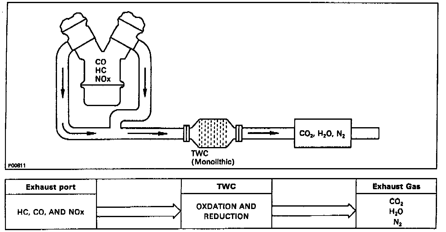 The Three Way Catalytic Converter (TWC) simultaneously removes up to 90% of all three major pollutants, Hydrocarbons (HC), Carbon Monoxide (CO) and Oxides of Nitrogen (NOx). A complete catalytic reaction depends on the fuel mixture staying within a very narrow range (±1% of 14.7:1) which can only be achieved with a properly functioning oxygen sensor feedback system.