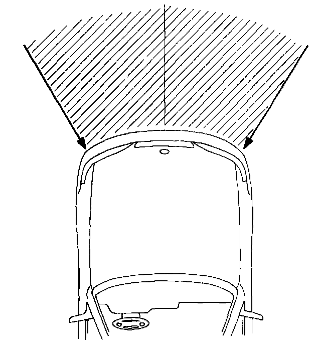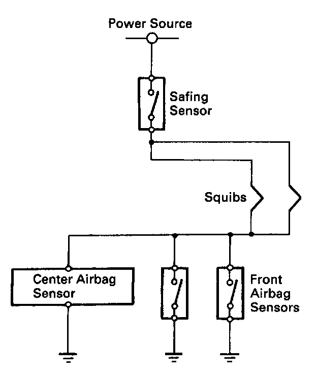 When the vehicle is involved in a frontal collision (the hatched area), and the shock is larger than a predetermined level, the SRS is activated automatically. Safing sensors are designed to go on at a smaller deceleration rate than the front and center airbag sensors.