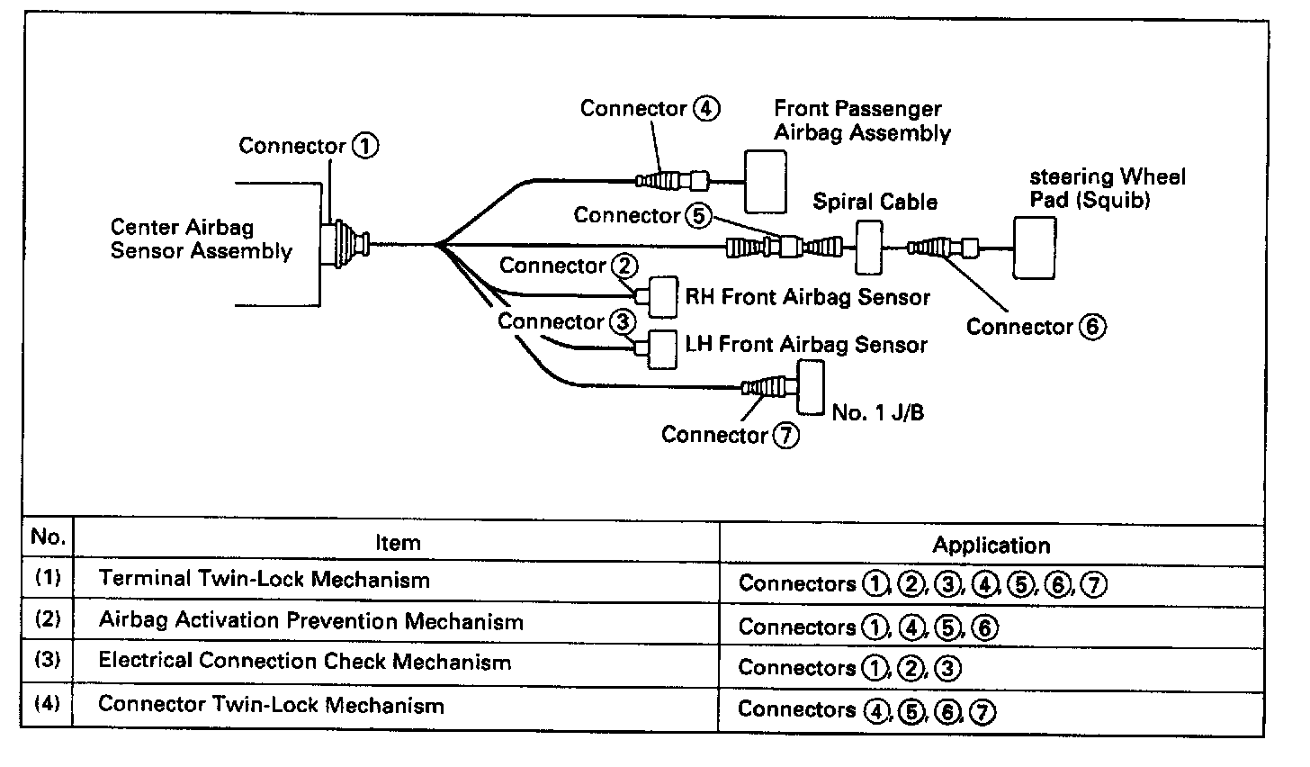 All connectors in the supplemental restraint system are colored yellow to distinguish them from other connectors. Connectors having special function and specifically designed for SRS are used in the locations shown below to ensure high reliability. These connectors use durable gold-plated terminals.