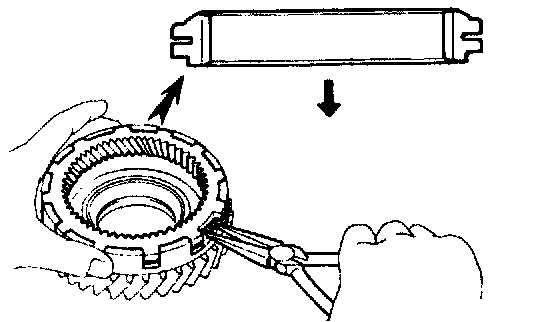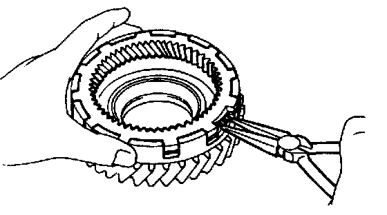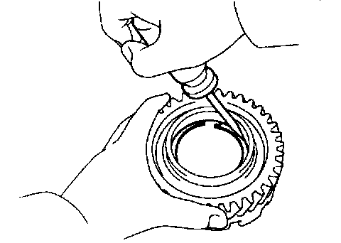 b. While pushing down the ring gear, squeeze the snap ring end with needle-nose pliers, and install it into the groove.