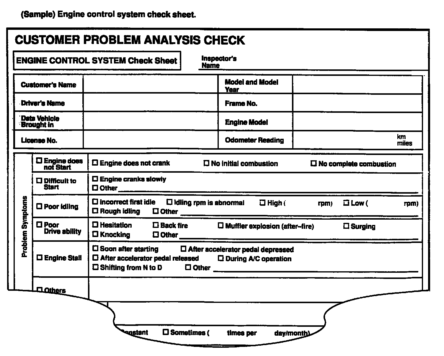 The following 5 items are important points in the problem analysis. Past problems which are thought to be unrelated and the repair history, etc. may also help in some cases, so as much information as possible should be gathered and its relationship with the problem symptoms should be correctly ascertained for reference in troubleshooting. A customer problem analysis table is provided in the diagnostics section for each system you use.