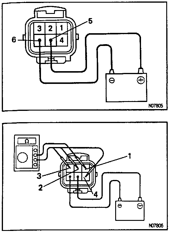 Connect positive lead from battery to terminal 5 and battery ground lead to terminal 6, Fig. 24, check that motor operates. To check continuity, check that current flows between terminal 1 and 2, 1 and 3 and 1 and 4 while motor is operating. If operation is not as specified, replace motor.