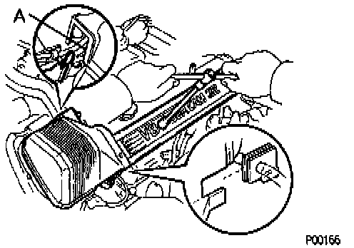 - Fit the portion A of the timing belt cover, matching it with the lower high-tension cord cover.
