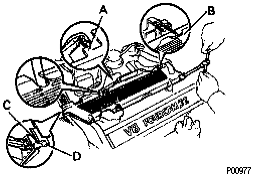 - Fit the portions C and D of the engine wire cover, matching them with the lower high-tension cord cover and No. 3 timing belt cover.