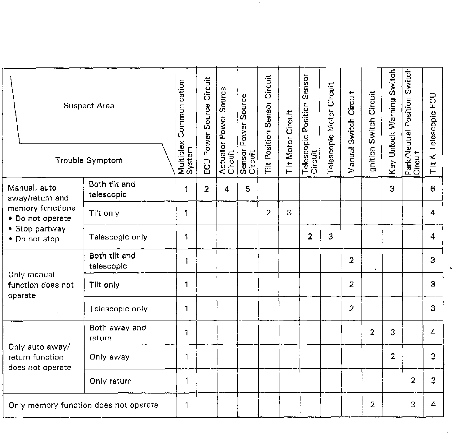 ^ If the trouble still reappears even though there are no abnormalities in any of the other circuits, then check and replace the Tilt & Telescopic ECU as the last step.