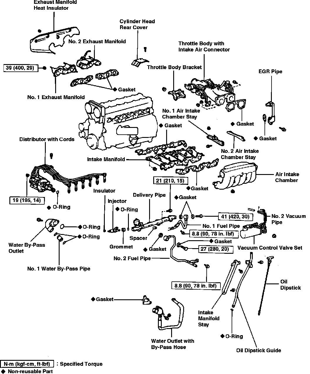 10. Remove air intake chamber, fuel delivery pipe, injectors and fuel pipes.